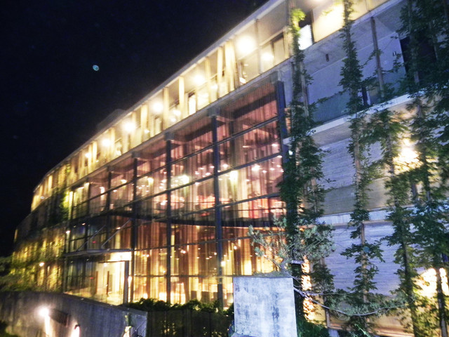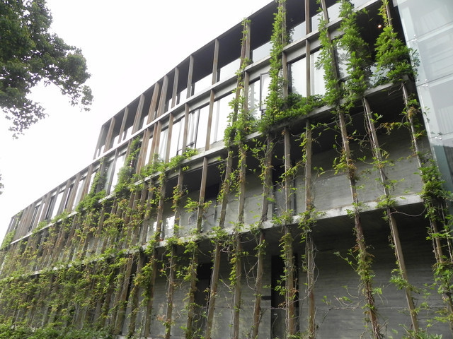 它是由清水模、玻璃、肖楠木建構的外觀,