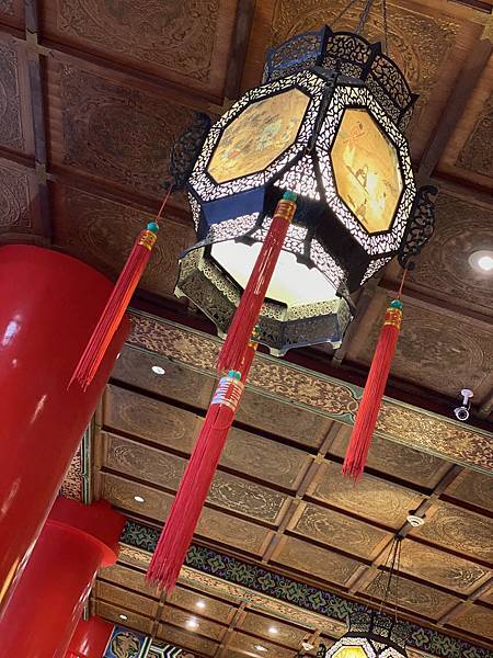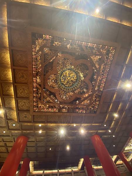 (▶抬頭一望,梅花藻井 最中央是五條金龍圍著一顆明珠,代表五福臨門 )