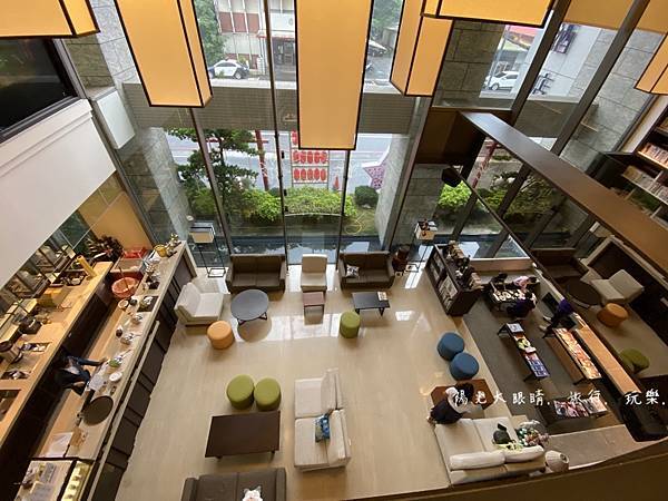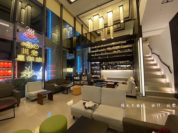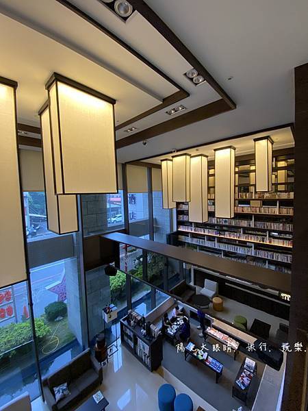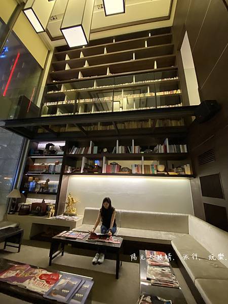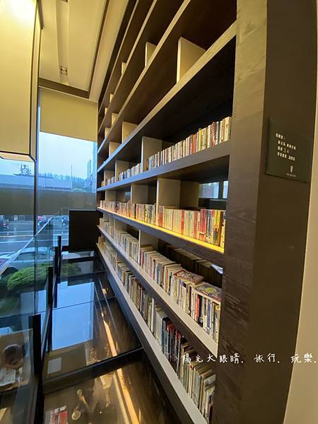 就位於一樓櫃台左前方,有一處很網美風的挑高書牆,很喜歡那裡的空間環境,可以選擇想看的書本做在沙發區,旁邊有一些簡單的餅乾點心與咖啡任您使用,挑高書牆的二樓還有一個透明空橋,穿裙子的人可別走在空橋上,因為底下的人抬頭看就會春光外洩囉!!