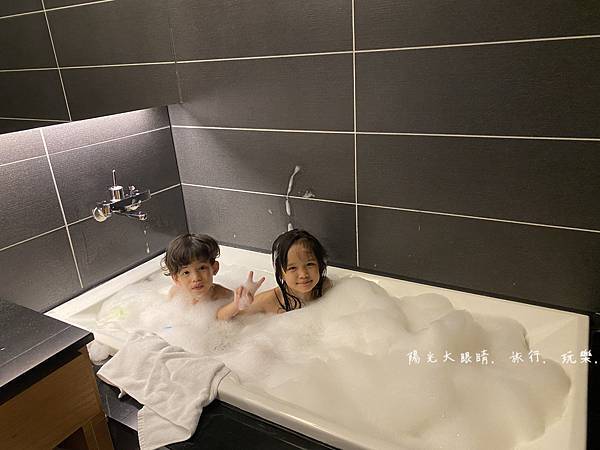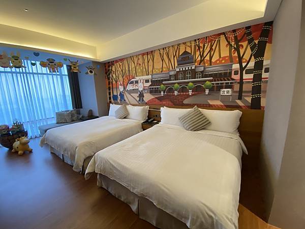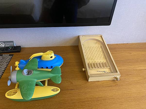這是我們入住的是家庭親子彩繪房,房間採大量木質裝潢,一進房門,孩子不斷「哇哇哇」的驚嘆,因為房間處處充滿玩具,房間佈置得也很童趣,有古早的彈珠台、還有許幫助手眼協調的玩具、小車車、童話書,還有一些泡澡用的玩具,我們這次還帶了泡泡沐浴球讓小孩玩泡泡澡。